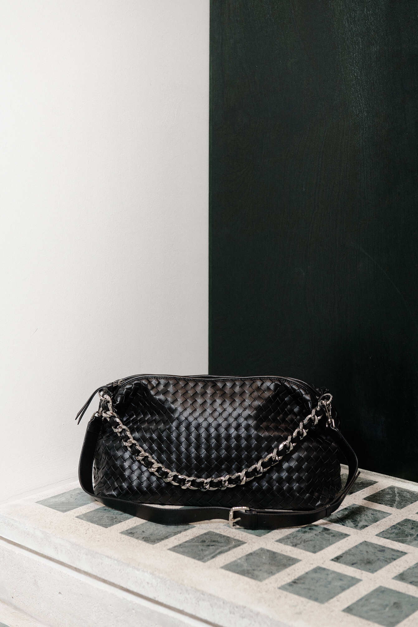 - Comes with a detachable chain shoulder strap and a detachable crossbody strap